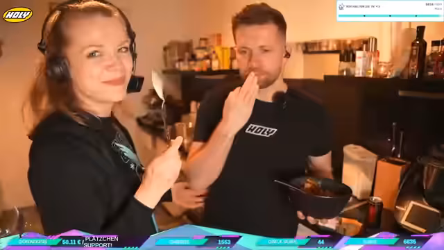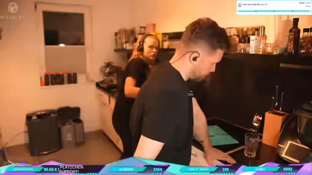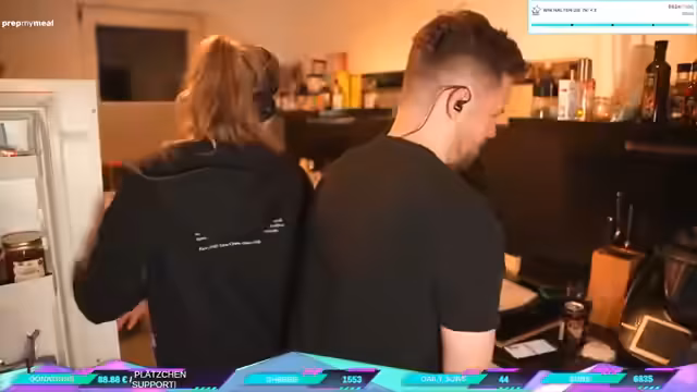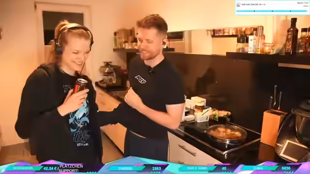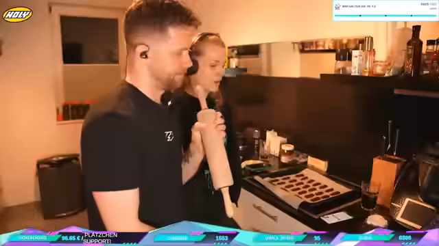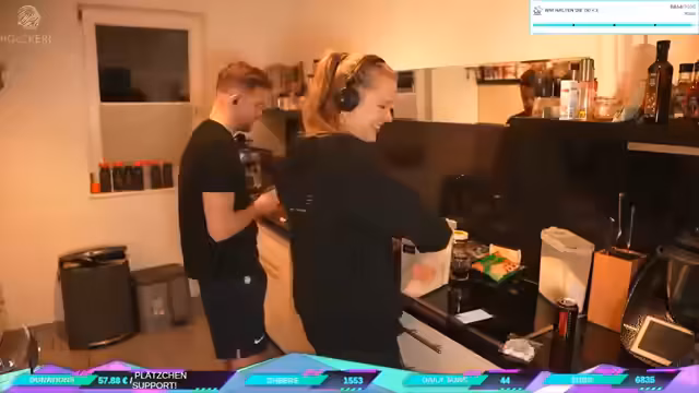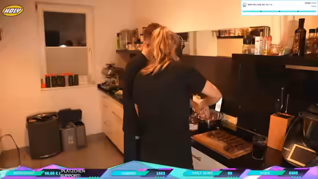 02:21:57Der Streamer beginnt mit seiner Partnerin eine Backsession für Butterplätzchen. Beide stellen fest, dass sie das Rezept nicht parat haben und improvisieren. Sie diskutieren über Teigarten (Mürbeteig) und starten mit dem Abwiegen der Zutaten: 125g Butter, 200g Mehl (Typ 405) und 100g Zucker. Der Chat hilft bei der Schätzung der Mengen, während technische Probleme mit der Küchenkamera (Verzögerung) thematisiert werden. Der Streamer erklärt den Zweck des Backens als gemeinsame Aktivität und betont, dass er gerne Zeit in der Küche mit seiner Partnerin verbringt.
