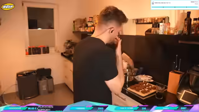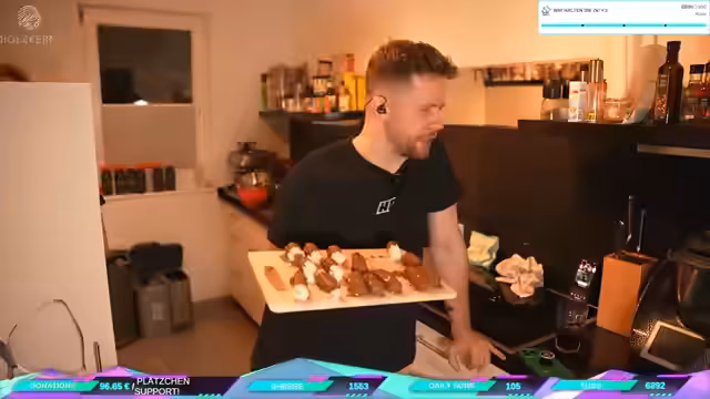 05:09:14Der Stream beginnt mit kulinarischen Vorbereitungen, bei denen über das Zubereiten von Kotelett und vegetarischen Alternativen diskutiert wird. Es wird betont, dass jede*r essen solle, was er*sie möchte, wobei Fleisch als besonders lecker hervorgehoben wird. Gleichzeitig wird der Blick auf den Kochprozess gelenkt, indem erklärt wird, dass noch Zeit für weitere Zubereitungsschritte bleibt, während über die Konsistenz von Nougatcreme und das Aussehen fertiger Nougatstangen spekuliert wird. Dabei wird humorvoll die eigene Rolle als Influencer für vegane/vegetarische Ernährung angesprochen.