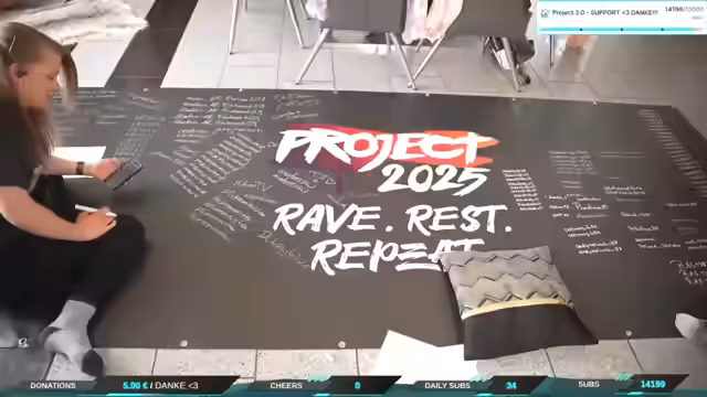 01:13:20Der Stream nähert sich dem Ende. Die Moderatorin betont nochmals den Erfolg des Projekts und die tolle Atmosphäre. Sie erwähnt, dass sie in den nächsten Tagen jeden Tag live sein wird. Abschließend werden persönliche und alltägliche Themen wie Wäsche und Größe thematisiert, bevor der Fokus endgültig auf das anstehende Schreiben gelenkt wird und die Streamerin um Stifte bittet.
