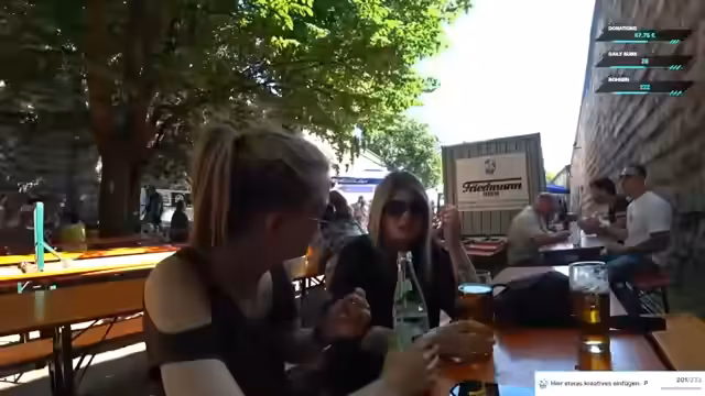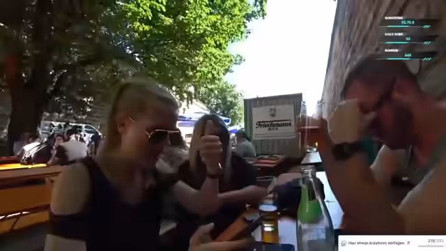 02:15:52Nach einer kurzen Kontrolle betreten sie das Bierfest und machen sich sofort auf den Weg zu den Getränkeständen im Schatten. Der Streamer ist von der Vielfalt an Biersorten und Essensmöglichkeiten begeistert, darunter Kellerbier, Halloumi und Erdbeeren. Er beschreibt das als Rückkehr in alte Zeiten und findet es fantastisch. Dabei erwähnt er auch, dass das Streamen mit viel Technik am Festival für neugierige Blicke bei den Anwohnern sorgt, was für die beiden aber nichts Neues ist.