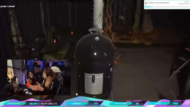 02:42:41Die Barbecue-Zubereitung wird durch ein technisches Problem unterbrochen. Die Temperatur im Smoker fällt unerklärlicherweise auf 0 Grad. Die Streamerin versucht, das Problem zu lösen, indem sie Kohle nachlegt und den Deckel öffnet, um für mehr Sauerstoff zu sorgen. Die Zubereitung des Fleischs verzögert sich dadurch, was im Chat kommentiert wird. In der Zeit wird weiterhin an den ASMR-Experimenten gefeilt.