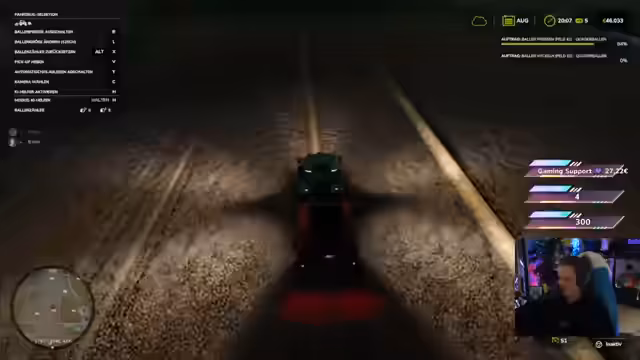 00:41:50Nachdem das erste Feld erfolgreich abgeerntet wurde, fahren sie mit dem zweiten Feld fort. Es kommt erneut zu Problemen mit der Abladung der Ernte und der Streamer ist genervt von der wiederkehrenden Situation. Dennoch bleibt die Stimmung trotz der technischen Hürden größtenteils gelassen. Die Streamerin beginnt mit der Herstellung von Heuballen und erkundet im Spiel die Möglichkeiten, diese zu verkaufen, was weitere Vorbereitungen und Abläufe erfordert.