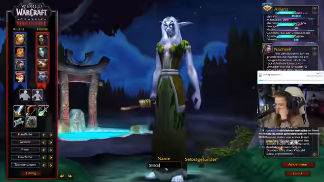 01:51:49Nachdem alle technischen Vorbereitungen, wie die Installation der notwendigen Add-ons über CurseForge, abgeschlossen sind, beginnt der Streamer mit seinem Spiel. Er erstellt einen Nachtelfen Druiden namens Synthica. Aufgrund der vielen teilnehmenden Streamer ist die Gefahr von Kill-Stealing hoch, daher wird die Aufmerksamkeit auf die Beobachtung des Chats gelenkt. Der Start auf Level 1 gestaltet sich, wie erwartet, sehr unspektakulär und langsam, was als normal für die Anfangsphasen eines solchen Events beschrieben wird.