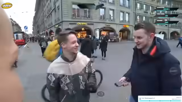 09:10:15Der Streamer wird von Personen angesprochen, die TikTok-Werbung für die Ski-Freestyle-WM in der Schweiz machen. Er führt ein kurzes Interview mit ihnen, in dem er nach ihren Erwartungen an die WM fragt und sie bittet, die Teilnehmer zu motivieren. Die Werber erklären, dass bei der WM viele Kunststücke auf Skiern gezeigt werden. Auf die Frage nach dem wildesten Trick antwortet einer der Werber scherzhaft, er würde mit einer Rakete hinten drauf bis zum Mond fliegen. Der Streamer fragt, ob er dumm sei, woraufhin einer der Werber entgegnet, dass dies in der Schweiz erlaubt sei. Zum Abschluss des Gesprächs wünscht der Streamer den Werbern einen schönen Tag und bedankt sich für das Interview. Er betont, dass die Schweizer Reisen auf jeden Fall rausschmissen müssen und lobt die Aussage, dass man die Wahrscheinlichkeit tiefer, du bist ja deutsch.