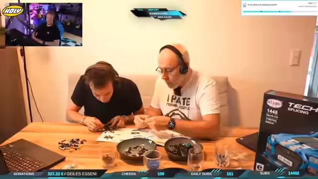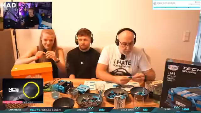 03:22:08Beschreibt die aktuelle Situation mit Mods (Moritz, Tobitz, Leon) im Stream. Hinweis auf Platzmangel durch versammelte Personen. Fortführung des LEGO-Baus mit Suche nach einem spezifischen Teil, das fehlt und für den Weiterbau entscheidend ist. Stream zeigt Verwirrung über technische Probleme mit dem Audio und erwähnt Eingriffe von Annika zur Problemlösung. Chat interagiert mit Lösungsversuchen und humorvollen Kommentaren.
