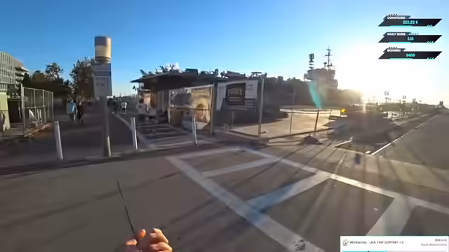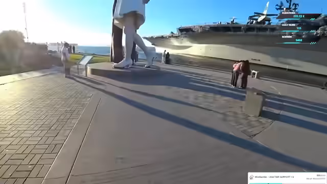 00:43:59Während des Spaziergangs am Hafen wird die Umgebung als 'wie in GTA' beschrieben. Es werden verschiedene Stände und eine Barmeile erwähnt. Besonders beeindruckend ist der Flugzeugträger USS Midway, der als Museum dient. Es wird über die Geschichte des Schiffes gesprochen, das im Zweiten Weltkrieg in Dienst gestellt wurde und an Kriegen in Vietnam und im Zweiten Golfkrieg teilnahm. Die Größe des Schiffes und die Anzahl der Besatzungsmitglieder (4.000 für 100 Flugzeuge) werden als beeindruckend empfunden. Es wird diskutiert, ob man mit der Kamera auf das Militärschiff darf, aber da es geschlossen ist, bleibt dies unklar. Eine Statue am Hafen, die Matrosen darstellt, die ihre Frauen in die Arme nehmen, wird als 'sweet' beschrieben. Der Streamer äußert Bedenken bezüglich der Internetverbindung in der Nähe des Schiffes aufgrund der großen Stahlmengen und plant für zukünftige Streams den Kauf von drei SIM-Karten, um eine stabilere Verbindung zu gewährleisten.