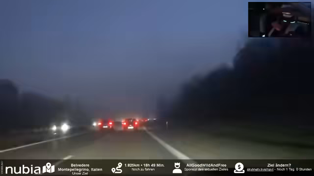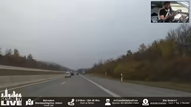 03:51:49Ein entscheidender Wendepunkt im Stream wird erreicht: Ein Zuschauer namens All Good Wild and Free hat das Navi-Ziel geändert. Die neue Route führt nach Belvedere auf Monte Pellegrino in Palermo, Italien. Dies erfordert sofortiges Manövrieren: Die Autobahn A3 wird verlassen und die A7 in Richtung Süden genommen. Der Streamer ist von der plötzlichen und langen Reise begeistert und diskutiert die Machbarkeit der rund 2.200 Kilometer langen Fahrt in den nächsten Tagen.