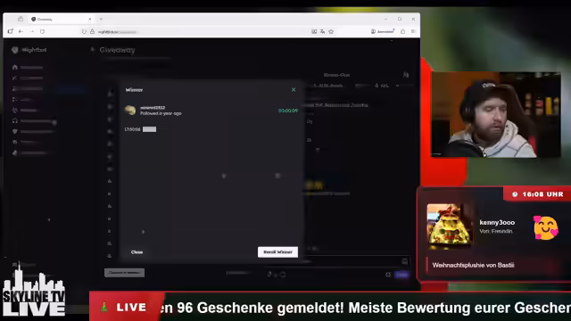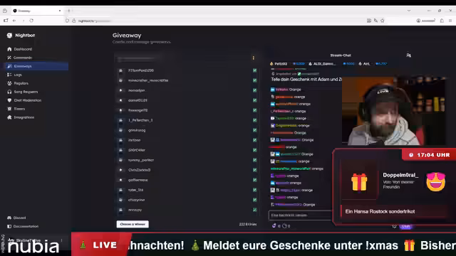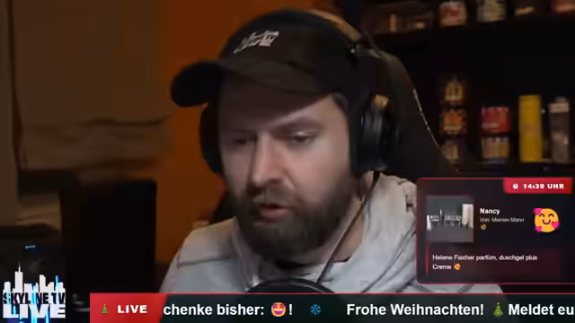 02:39:45Es läuft eine Verlosung, für die man Follower sein muss. Der Streamer diskutiert Produkte wie 'Scamble-Truckstüten' und zeigt Holy-Spekulatius. Er erwähnt kurz 'South Stream' als Event und kündigt weitere Aktionen an. Die Stimmung ist feierlich, während er auf Zugang zu einem Rabattcode hinweist.