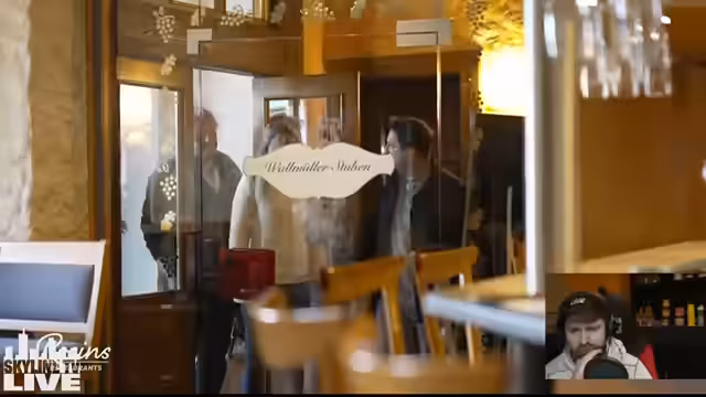 04:28:26Die Ankunft im Wallmüller-Stuben offenbart eine Überraschung: eine lokale Blaskapelle wartet bereits vor dem Restaurant. Der Streamer äußert anfangskeine Zweifel, ob das geplant ist. Beim Betreten des Lokals fällt die überwältigende Menge an Schildern und Plakaten vor der Tür auf. Innen dominiert eine überwältigende Dekoration mit unzähligen Pflanzen, die den Durchgang versperren, sowie staubige Gegenstände aus einer längst vergangenen Zeit. Ein Schild mit der Aufschrift 'Beilagensalat' sorgt für Verwirrung und wird thematisiert.