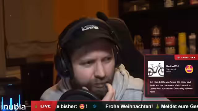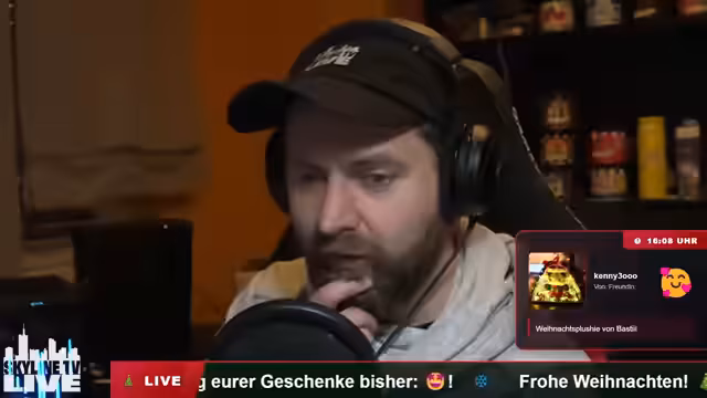 08:28:10Der Streamer diskutiert Geschenke der Community: Ein E-Bike für Alex, ein Sim-Racing-Set, Bücher, Socken und Food-Körbe. Besonders hervor gehoben werden humorvolle Gaben wie ein Schwert oder Werbegeschenke. Die Diskussion zeigt die verbundenheit zur Community, die auch während des Streams durch Sub-Geschenke (z.B. von 'Sebotwo' und 'Rollender Rettich') und emotionalen Nachrichten ('für alle einsamen Heiligabend') gestärkt wird.