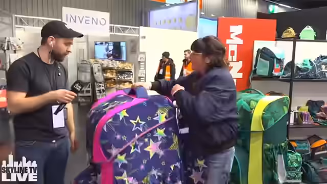 02:19:48Ein besonderes Highlight ist der Riese Schulranzen, der ausprobiert wird. Die Moderatoren und ein Standbetreiber präsentieren und tragen den überdimensionierten Ranzen. Es werden Vergleiche zu eigenen Schulzeiten gezogen und Humor über das schwere Gepäck getrieben. Das Potenzial für künftige Wanderungen mit dem Gepäck wird als Meme-Feld ausgelotet.