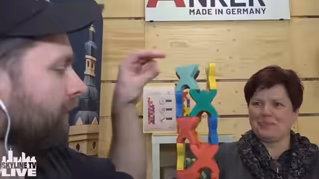 05:20:00Der Streamer besucht den Stand von Ankerstein, der echte Bausteine aus einem Gemisch aus Sand, Kreide und Leinöl herstellt. Diese Bausteine sollen ein echtes Stein-Feeling vermitteln und das räumliche Vorstellungsvermögen fördern. Es folgt ein spannendes Bau-Duell, bei dem der Streamer und ein Mitarbeiter versuchen, eine Form nachzulegen. Dabei stellt der Streamer fest, dass das Material extrem stabil ist und durch sein Eigengewicht zusammenhält, was eine große Herausforderung darstellt.