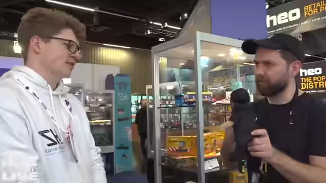 00:37:14Der Streamer stößt auf den Stand eines Unternehmens, das eine smarte, vernetzte Murmelbahn präsentiert. Das Besondere daran ist, dass Kugeln nicht nur physisch auf der Strecke rollen, sondern auch über Teleporter weltweit an andere Orte weitergeleitet werden können und dort wieder auftauchen können. Die Bauelemente sind erweiterbar und können mit Smart-Home-Systemen wie Philips Hue oder Home Assistant verbunden werden, um beispielsweise Lichteffekte oder Aktionen per E-Mail auszulösen. Der Streamer zeigt sich von dieser innovativen Idee beeindruckt und sieht großes Potenzial für den Retail-Markt.