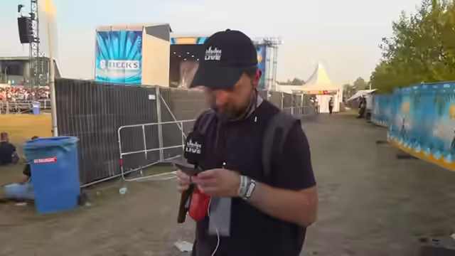01:21:54Ein Festivalbesucher aus der Schweiz teilt mit, dass er für die K.I.Z.-Auftritte extra angereist ist. Die Streamer erwähnen das aktuelle Line-up, darunter Blond, Leoniden und die versprochene Deichkind-Show am Abend. Sie machen darauf aufmerksam, dass man vom hinteren Bereich aus einen guten Blick auf die Bühnen hat und die Hauptacts live mithören kann.