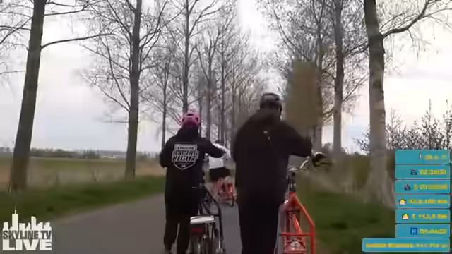 12:29:41Während der Fahrt nieselt es leicht und die Kameras werden nass. In einer Stunde soll es jedoch stark regnen, möglicherweise muss die Gruppe dann anhalten. Es wird überlegt, ob man die Zeit mit einem Spiel überbrücken soll. Die Landschaft erinnert langsam mehr an Hamburg als an Holland. Nach jeder Pause freuen sich die Teilnehmer wieder aufs Fahren. Der Chat fordert, die Kameras zu putzen. Es wird befürchtet, dass die anderen Teilnehmer verloren gegangen sind, da die Gruppe durch das Spielen eines Spiels den Anschluss verloren hat. Die Akkus sind fast leer und die verbleibende Strecke zum Hotel wird zur Herausforderung. Ein Teilnehmer verwechselt den Chat mit dem von Papa-Platte. Ein anderer Teilnehmer wird für seinen peruanischen Poncho geflamed, der ihn aber trocken hält. Joffi hatte eine Woche vor der Tour auf das Regenwetter hingewiesen, aber nur Marc hatte zwei Jacken dabei. Ein Teilnehmer versteigerte seinen Rucksack mit Regenhose für einen guten Zweck. Marc joggt auf seinem Laufbandrad, während ein anderer Teilnehmer sein Handy bedient. Die Teilnehmer sprechen über ihre gemeinsame Zukunft und ob sie sich mit 60 Jahren noch kennen werden. Es wird überlegt, ob man im Alter in Hamburg, Peru oder der Schweiz leben würde. Holland wird in 15 Jahren möglicherweise überflutet sein. Die Teilnehmer loben Riel für seine Kellnerarbeit. Es wird über das fettige Essen und die Wahrscheinlichkeit, dass jemand kotzt, gesprochen. Die Tour ist anstrengender als die E-Scooter-Tour, da sie physischer ist. Tabeck klagt über brennende Füße und Oberschenkel. Es wird diskutiert, wie viele Teilnehmer es wirklich bis nach Hamburg schaffen werden und ob die Lopi-Fit-Fahrräder durchhalten werden.