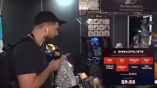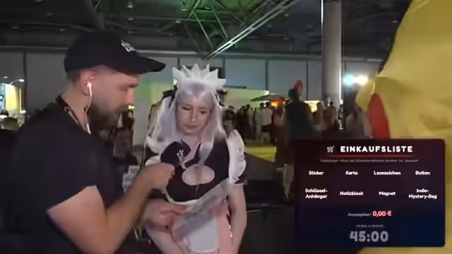 02:41:15Der Streamer beginnt eine Herausforderung, bei der er versucht, innerhalb von 45 Minuten eine Einkaufsliste mit bestimmten Artikeln auf der Messe zu erfüllen. Die Liste umfasst unter anderem Karten, Lesezeichen, Buttons, Schlüsselanhänger und Magnete. Er scheint gestresst, da er viele Dinge schnell finden muss und ständig auf Zeitdruck ist, wobei er auch über die Preise der verschiedenen Artikel spricht und bezweifelt, dass er alles schaffen wird.