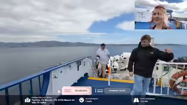01:21:01Der Stream beginnt mit der Ankunft auf der Fähre nach Sizilien. Das Wetter ist im Gegensatz zum Vortag nicht so gut, da starker Wind und der angedronte Regen eine unsichere Variable darstellen. Während die Fähre anlegt, wird eine Fußballtor-ähnliche Struktur mit einem Achtungsschild gesichtet und es werden erste Eindrücke von der Überfahrt geteilt. Ein Rettungsring mit einer integrierten Glühbirne wird als besondere und originelle Entdeckung erwähnt, was für die chaotische und zugleich charmante Atmosphäre der Fähre steht.