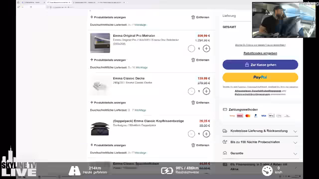 03:50:48Ein zentrales Thema war das Unternehmen Emma, das als One-Stop-Shop für Schlafzubehör beworben wird. Der Streamer diskutierte persönliche Erfahrungen mit den Produkten, wie zu kleine Bettdecken, und berichtete von positiven Feedbacks zu den Stützkissen, die von seiner Freundin genutzt werden. Es wurde betont, wie wichtig guter Schlaf sei und dass Emma mit Schlafwissenschaftlern zusammenarbeite. Der Streamer testete daraufhin die Bestellfunktion, ließ sich von der Chat-Community nach Dänemark liefern und teilte den Rabattcode 'Skyland TV' für einen zusätzlichen Nachlass auf alle bestehenden Angebote.