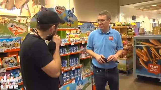 00:17:48Während des Ganges durch die Regale werden verschiedene Produkte besprochen, darunter Babybell-Käse, Lindt-Schokolade und verschiedene Chip-Sorten. Dabei fällt auf, dass einige Regale leer sind. Der Streamer interagiert mit dem Assistent eines Mitarbeiters, Eugen, und unterhält sich über den Supermarktalltag. Wichtig ist ihm, darauf hinzuweisen, dass es sich um einen Livestream handelt, um datenschutzrechtliche Probleme zu vermeiden, und dass alle gekauften Produkte am Ende bezahlt werden.