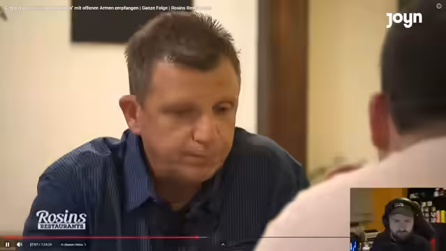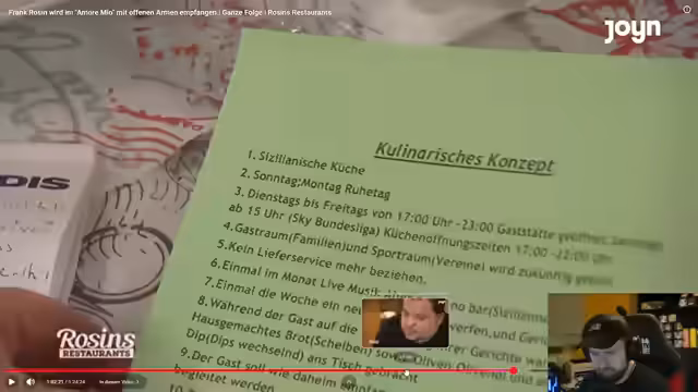 00:42:39Der Streamer präsentiert die Folge über das sizilianische Restaurant 'Amore Mio' von Salva im unterfränkischen Kollenberg. Er analysiert die Probleme des Wirts: Der Gastraum wirkt unprofessionell und chaotisch, die Speisekarte ist mit nicht-italienischen Gerichten überladen und der Verein übt zu viel Einfluss aus. Der Fokus liegt auf der mangelnden Führungsstärke von Salva und der daraus resultierenden Desorganisation im Service und in der Küche.