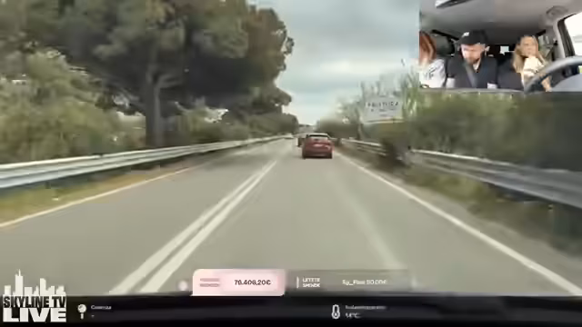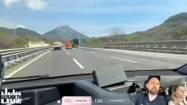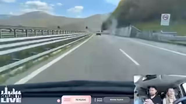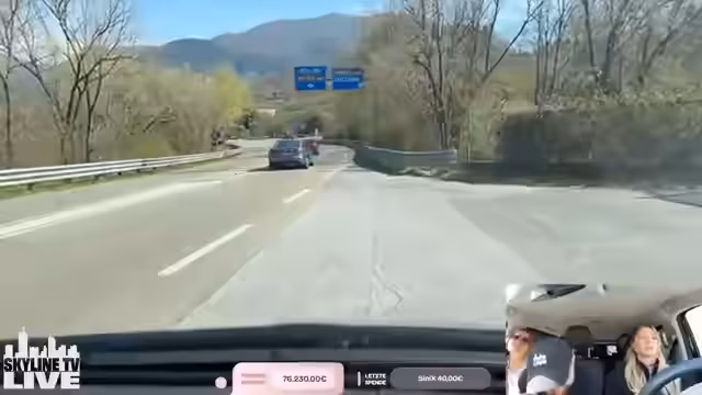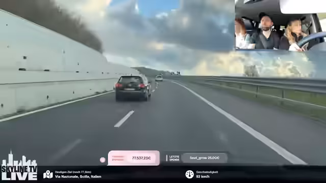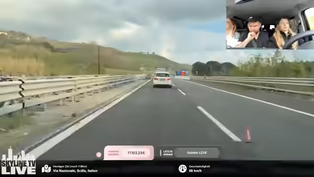 02:42:48Während der Fahrt durch Italien beschreibt der Streamer anhaltende technische Probleme mit seinem iPhone, insbesondere das ungewollte Hochfahren des Bildschirms beim Laden und die umständliche Bedienung des Touchscreens, bei der auf die Außenflächen der Gruppen anstatt direkt auf die Buttons geklickt werden muss. Es kommt zu unerwarteten Audio-Unterbrechungen durch das Radio, das sich zufällig einschaltet. Die Fahrerin berichtet von ungewöhnlichen Verkehrsereignissen, wie einem Tunnel, der sich als Brücke herausstellt, und einer kurzen Sichtung der Guardia di Finanza, dem italienischen Finanzamt, mit Blaulicht.