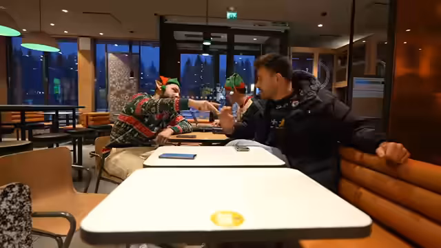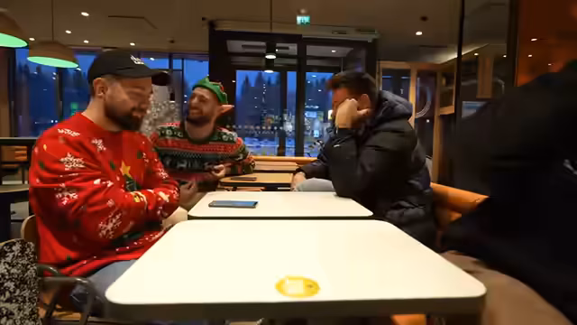 02:56:42Die Gruppe erreicht ein McDonald's-Restaurant in Finnland. Es werden Bestellungen für verschiedene Burger wie den Big Tasty Bacon ohne Tomate, den Triple Cheeseburger und Veggie-Optionen aufgegeben. Ein Produktberater namens Boris gibt Empfehlungen, darunter den Quarter Pounder Cheese, der als einer der besten Burger auf dem Planeten bezeichnet wird. Es wird betont, dass die Nuggets in Finnland anders schmecken als in Deutschland.