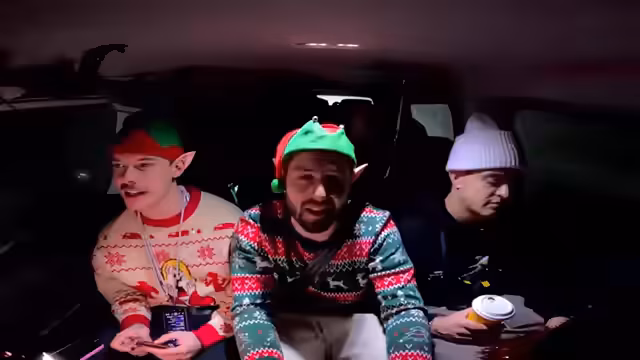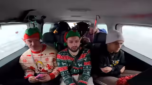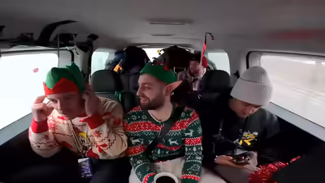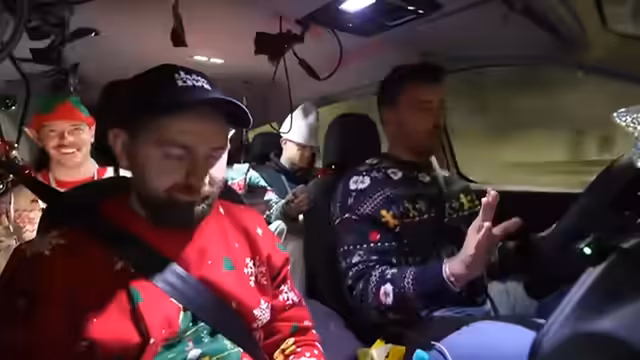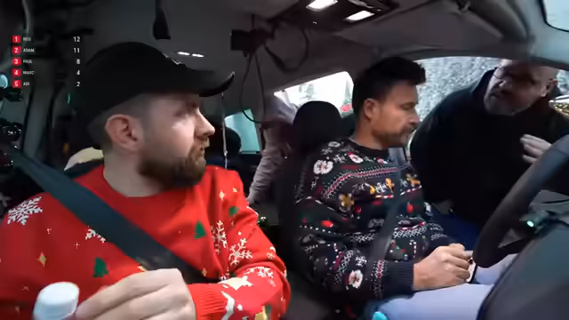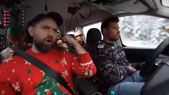 00:50:20Nach dem Tankstopp wurde ein musikalisches Segment eingeleitet. Adam wurde gebeten, einen Weihnachtssong einzuspielen. Da dies nicht geschah, wurde beschlossen, das Spiel 'Leichte 5' zu spielen, ein Quiz mit Punktesystem, um die Unterhaltung während der Fahrt aufrechtzuerhalten.