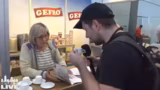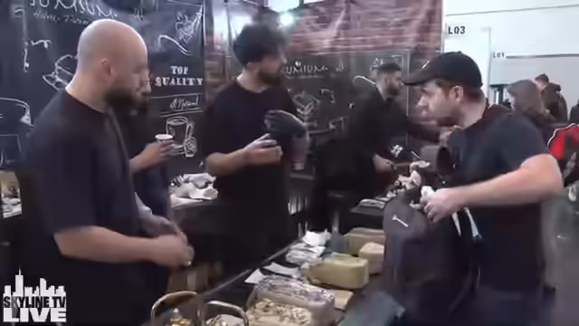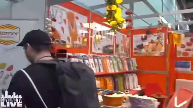 02:04:01Nach einem kurzen Umweg wechselt der Streamer mit seinem Team in Halle 3, um mehr Abwechslung zu finden. Er besucht einen Stand der Techno GmbH, der Gerätschaften für Partys herstellt. Dort wird ein zufälliger Sänger vorgestellt, was als verwirrendes Standgespräch beschrieben wird. Anschließend wird ein Käsehobel aus der Schweiz vorgestellt, der Käse in Rosetten formt, und der Streamer probiert den sogenannten Mönchskopf-Käse.