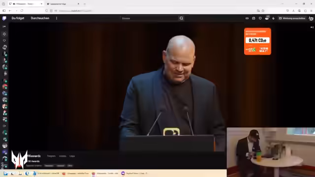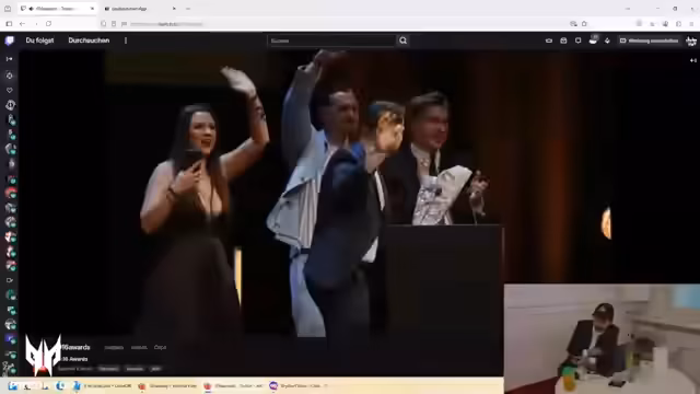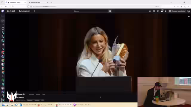 00:14:48Der Stream beginnt mit der Begrüßung der Zuschauer als Party People und einem kleinen technischen Hinweis zur Speicherkarte. Der Streamer befindet sich im Backstage-Bereich der 9:16 Awards und bewegt sich frei zwischen den Räumlichkeiten, was ihm den Zugriff auf verschiedene Bereiche ermöglicht. Er erwähnt, dass der Saal restlos ausverkauft ist und viele Promis anwesend sind, und gibt einen ersten Einblick in die laufende Show auf der Bühne, die von Herrn Gietchen und Frau Weibart moderiert wird.