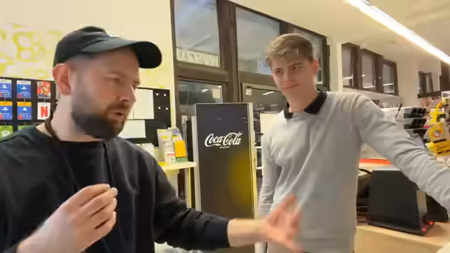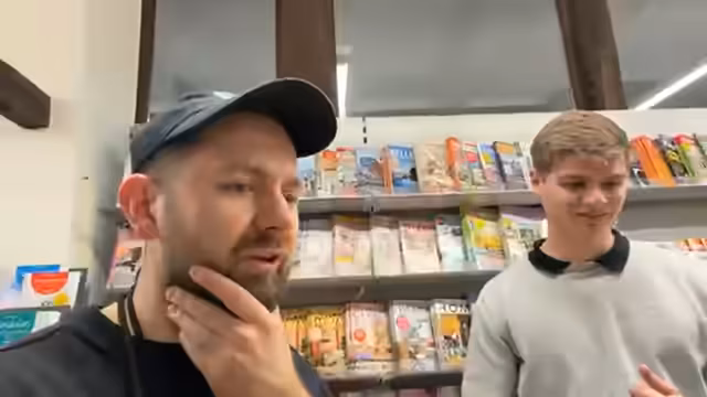 00:37:17Nach einem kleinen Orientierungsfehler trifft der Streamer an einem Ort ein, der ihn an den Stream des Vorjahres erinnert. Er erwähnt den Kaugummiautomaten und ein Terminal, das er damals zu hacken versuchte. Die Hauptverabredung findet in einem Zeitschriftenladen statt, den der Streamer über TikTok entdeckt hat. Der Inhaber berichtet, dass er hier das Monopol für Zeitschriften in Hameln hat und über 1500 verschiedene Ausgaben führt, trotz des allgemeinen Trends, der das Aussterben von Zeitschriften voraussagt.