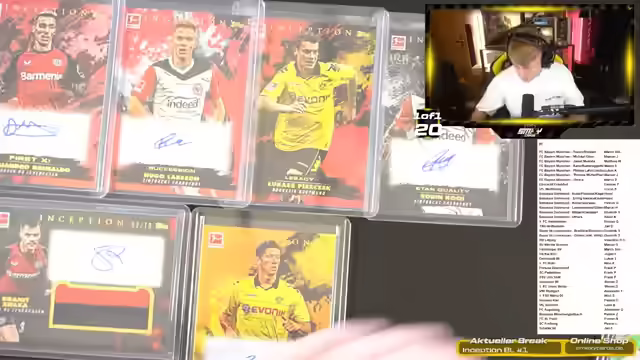 01:39:49Die letzte Inception Box wird geöffnet. Es gibt kein Booklet. Es werden Armin Gigowitsch, Andi Herzog und Benze Baini gezogen. Es folgt Jeremy Frimpong von Leverkusen zu 20 von 25. Das letzte Auto ist Kevin vom HSV zu 16 von 49. Die letzten zwei nummerierten Karten sind Wo Young Young von Union Berlin und Zero die Rasier für den BVB. Es wird alles noch einmal vorgestellt, was aus den 10 Boxen gezogen wurde. Leverkusen, Frankfurt und Dortmund haben stark abgesahnt. Es wird überlegt, die Karten zu PSA zu schicken, sobald Melma bei PSA in Deutschland anfängt.