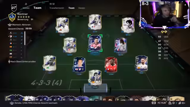 02:03:00Im Streamabschnitt wurden mehrere Spiele absolviert, wobei die Ergebnisse uneinheitlich ausfielen. So wurde ein Spiel mit 6-3 gewonnen, während ein anderes Spiel verloren ging. Anschließend wurden diverse Packs geöffnet, darunter Team of the Week Packs und Silverpacks. Die Ergebnisse variierten von Walkouts wie Grimaldo und Eiken bis hin zu durchschnittlichen Ziehungen wie Renat 88 und Endrick. Insgesamt wurden bei Ziehungen 85-Plus-Picks und Future Star Picks vermerkt, wobei bei letzteren garantiert keine zukünftigen Karten enthalten waren. Das angesagte Premium Elite Review Pack wurde kurz angesprochen, aber noch nicht geöffnet.