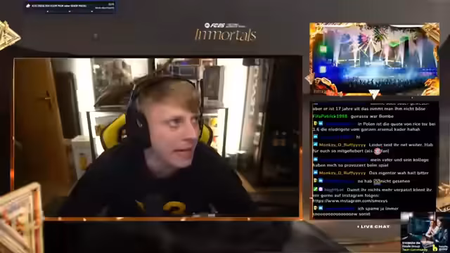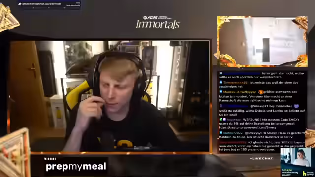 00:33:42Der Streamer äußert die Idee, sein komplettes Setup in den Garten zu verlegen und Garten-Streams zu veranstalten. Er kritisiert, dass verschuldete Vereine immer wieder durchkommen und spricht über Korruption im Fußball. Er überlegt, zu seinen Großeltern zu fahren, um dort zu streamen, sieht aber Probleme mit dem Internet und der Privatsphäre. Es wird über ein 980-Mustbeck-SBC gewitzelt. Der Streamer glaubt, dass Müller seine Karriere beenden wird und sieht ihn eher als Präsidenten denn als Trainer. Er schlägt vor, dass Müller zu LA Galaxy wechseln oder sich komplett zurückziehen könnte. Es wird über Mehmet Scholl gesprochen. Der Streamer hat gelesen, dass Bayern 140 Millionen investieren wird und Xabi Alonso zu Real Madrid gehen soll. Er äußert seinen Hass auf einen bestimmten Spieler wegen dessen arroganter Art. Es wird diskutiert, ob Kane zu Bayern wechseln wird. Der Streamer glaubt eher an Yildiz-Gerüchte. Er erwähnt, dass er gelesen hat, dass Kane wechseln will, kann dies aber nicht bestätigen.