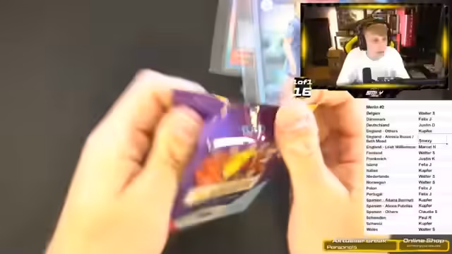 02:29:29Nach kurzer Unterhaltung öffnet der Streamer eine Merlin-Box mit 10 Spots. Er nennt die Nationalitäten der Käufer, darunter Niederlande, England, Deutschland, Portugal und Italien. Der Fokus liegt auf dem Spot von Kupfer, Walter und Jakusa. Während des Öffnens werden erste Karten wie Julian Brandt zu 1/50 und ein Ball Relic gezogen. Die Begeisterung der Zuschauer und die Spannung bei den Ziehungen sind zentral.