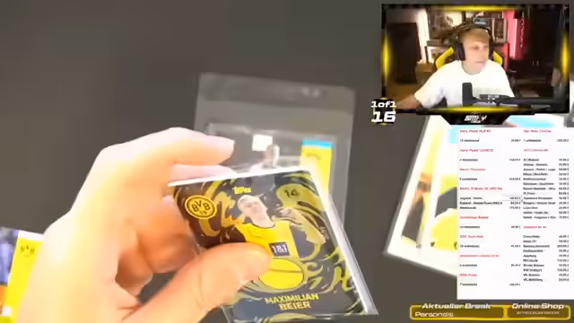 02:05:24Die Rückkehr nach dem Urlaub wird thematisiert und der Streamer ist fit für Story FIFA. Die Öffnung eines BVB-Team-Sets wird gestartet, bestehend aus Mittelmeistern. Gleichzeitig werden weitere Blaster-Öffnungen für verschiedene Chatter durchgeführt, bei denen nummerierte Karten und Inserts gezogen werden. Der Streamer lobt gute Pulls, wie zum Beispiel einen Stiller-Rookie-Auto, und zeigt das Endergebnis der Blaster.