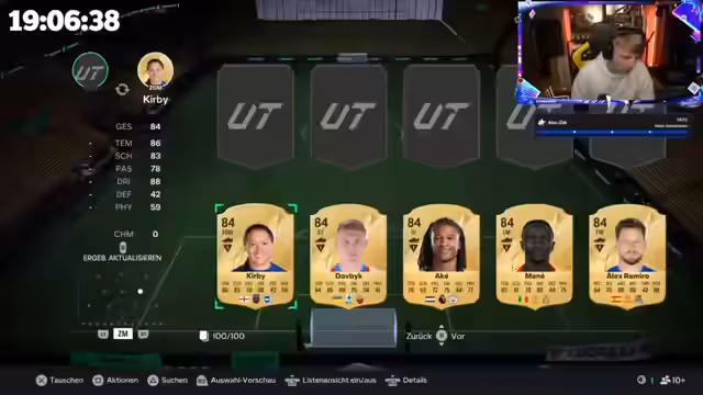 01:33:39Der Streamer öffnet mehrere dicke Packs mit hoher Bewertung, beginnend mit 84er Karten. Er hofft auf bessere Karten durch Doppel-Workout und erwähnt die Herausforderung, hohe Bewertungskarten zu ziehen. Die Viewer werden über die wachsende Anzahl an Karten im Verein informiert, während der Streamer versucht, sein Team mit den besten verfügbaren Karten zu optimieren.
