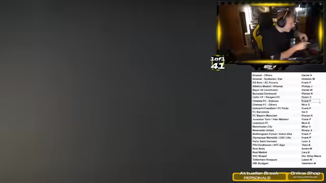 01:51:16Es werden weitere Karten gezogen, darunter Yunus Musa, ebenfalls nummeriert zu 99. Moritz' Box enthält zweimal zu 99 und einmal zu 75 nummerierte Karten. Lars sichert sich den Real Madrid Spot, wodurch nur noch drei Spots übrig bleiben. Daniel holt sich den Arsenal Spot, sodass nur noch Paris und Estebao übrig sind. Für den Estebao Spot werden "Filler" angeboten, bei denen 25 Lose für je 18 Euro verkauft werden, um den Spot zu gewinnen. Dies soll es für diejenigen erschwinglicher machen, denen der reguläre Preis zu hoch ist. Es wird betont, dass beim Ziehen einer zu 99er Karte bereits 80 Euro wieder eingespielt wären. Leon sichert sich den Paris Saint-Germain Spot. Es wird angekündigt, dass die Filler online sind und bereits drei davon verkauft wurden. Sascha öffnet eine weitere Box und zieht eine Rookie Dario Izugo XXL-Karte. Es wird auf die Möglichkeit eines Autogramms oder einer nummerierten Karte gehofft.