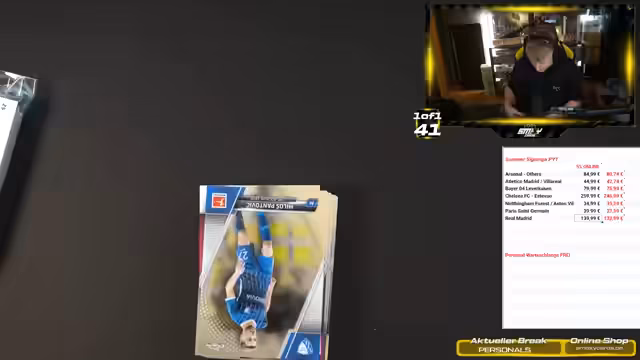 02:39:37Der Streamer zieht ein zweites Patch, was er als "sehr gute Quote aus vier Boxen, zwei Patches" hervorhebt. Es folgt ein "Champions League Auto zu 5" von Charrel Kwanza für den Leverkusen-Spot, was als "sau stark" gefeiert wird. Ein weiteres "Champions League Patch zu 50" von Ilya Zabarni für Paris Saint-Germain wird als "sehr, sehr nice" und "nächster Patch" bezeichnet. Die Box wird im Nachhinein als "ganz sauber" und "wieder gut" bewertet, da sie seltene Karten wie Eze zu 50 und Kwanza zu 5 enthielt. Die fünfte Box liefert einen Milos Kerkez für Liverpool zu 50 und ein Rookie-Auto von Claudio Echeverri für Leverkusen zu 99. Ein weiteres Auto von Malik Tillmann für New Signing zu 25 wird gezogen, was Leverkusen erneut als "komplett abräumend" hervorhebt.