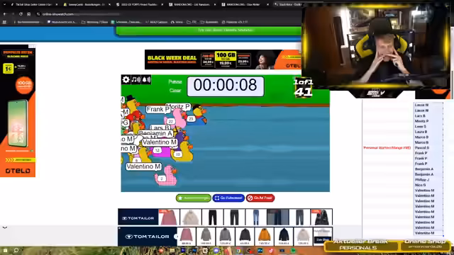 02:13:04Der Streamer beginnt mit der Abrechnung der Filler-Karten und listet die Namen der Käufer sowie die Anzahl der erworbenen Karten auf, wobei er sich bei jedem bedankt. Besonders hervorgehoben wird Valentino, der neun Stück erworben hat. Anschließend wird ein "Duck Race" als Verlosung für die Filler-Karten durchgeführt, bei dem 25 Namen in zufälliger Reihenfolge platziert werden. Frank gewinnt das erste Rennen, gefolgt von Valentino und Leon. Die Gewinner der ersten Plätze werden bekannt gegeben, wobei Frank den begehrten "Estevao-Spot" erhält.