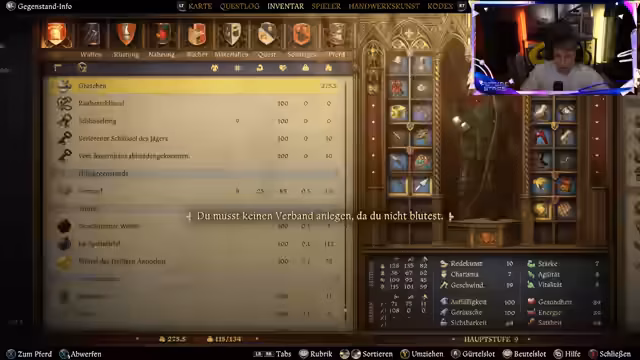 02:04:44Der Streamer verkauft weiterhin wertlose Gegenstände, um Platz zu schaffen. Dietrich und Werkzeuge werden behalten, da sie nützlich sind. Mit dem verdienten Geld wird bei einem Händler ein Jagdgürtel gekauft und neues Werkzeug für das Pferd besorgt. Da das Pferd überladen ist, müssen 20 Gegenstände abgelegt werden. Die Reise führt nun zum Ort Troskowicz, um dort die Hauptquests fortzusetzen und möglicherweise eine Runde Würfeln zu spielen.