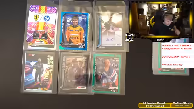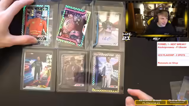 03:01:23Der Stream beginnt mit der Präsentation des neuen 'F1 Chrome'-Cases. Der Streamer geht zunächst auf mögliche seltene Inserts ein, die ihm gefallen würden, wie Karten von amerikanischen Sportlern oder Walking Dead-Themen. Anschließend werden die spezifischen Inhalte des Cases vorgestellt, darunter verschiedene 'On The Move'-Karten von Piloten wie Gasly, Cola Pinto, Ocon und Sainz sowie 'Duo'-Karten, die als besonderes Highlight angesehen werden. Der Preis des Cases wird als hoch, aber für den angebotenen Inhalt gerechtfertigt eingestuft. Der Fokus liegt klar auf der Präsentation von Formel-1-bezogenem Zubehör und sammelbaren Karten.