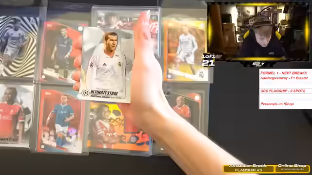 00:53:26Die Eröffnung der Flagship Breaks beginnt mit einem spektakulären Pull. Als erstes wird eine seltene, nummerierte Karte von Manchester United aus dem Jahr 1998 gezogen, die hohe Werte und große Begeisterung im Chat auslöst. Danach folgt ein weiterer hochwertiger Case mit Karten von Stars wie Karamba Diaby, Charlie Austin und Jonathan David, was als einer der besten Breaks des Streams bezeichnet wird.
