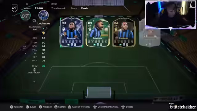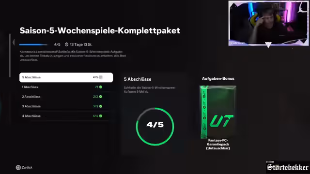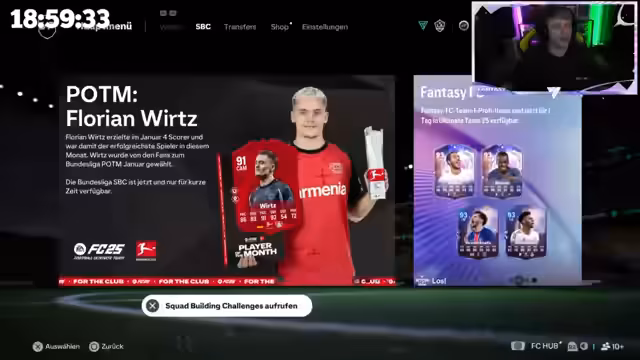 00:52:34Der Streamer widmet sich den täglichen und wöchentlichen SBCs. Er zeigt den aktuellen Stand seiner Liga-Team-SBCs und erklärt, warum das Matchmaking bei den Daily Tasks nicht fair ist. Er beginnt dann mit dem Fertigstellen von SBCs, wobei er eine Evolution für den Spieler Caceres plant, indem ihm Weak Foot und Shooting Boost hinzugefügt werden. Danach öffnet er zahlreiche Packs, um den SBC-Speicher zu füllen und neue Karten für seine Team-Builder zu ziehen, was zu den Reus-Icon-Karte führt.