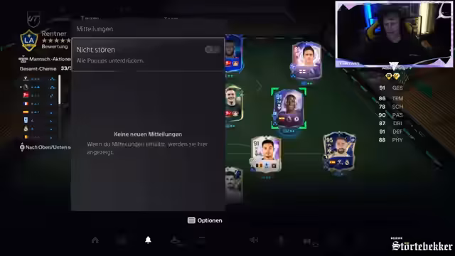02:47:53Der Streamer arbeitet daran, sein Team durch Upgrades zu optimieren. Spieler wie Puig, Malinowski und Marino werden getestet, um festzustellen, welche Upgrades sie in der Evolution erhalten. Er plant, den Spieler Puig auf ZM umzustellen und bittet die Viewer nach neuen Spielern für seine Evolution, die auf der ZM-Position spielen, da er auf diese Position dringend angewiesen ist und mit dem aktuellen Kader nicht weiterkommt.