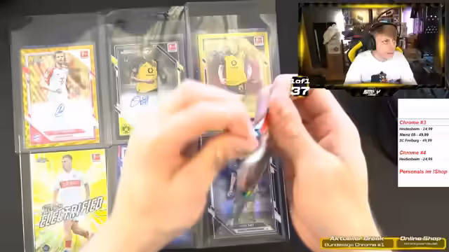 01:37:37Mit der sechsten Box wird die Hälfte des ersten Case Breaks abgeschlossen. Der Streamer bestätigt, dass 'sehr, sehr wilde' Karten gezogen wurden und geht mit positiver Stimmung in die zweite Hälfte. Die Ziehung wird mit Box Nummer 7 fortgesetzt. Hier werden weitere starke Pulls verzeichnet, wie ein Felix Matcher Ultra Refractor für Borussia Dortmund und ein Samuel Zandt zu 99 für Augsburg. Der Fokus bleibt auf der Suche nach den vermissten besonderen Karten wie Rookie Autos.