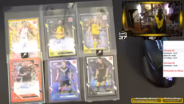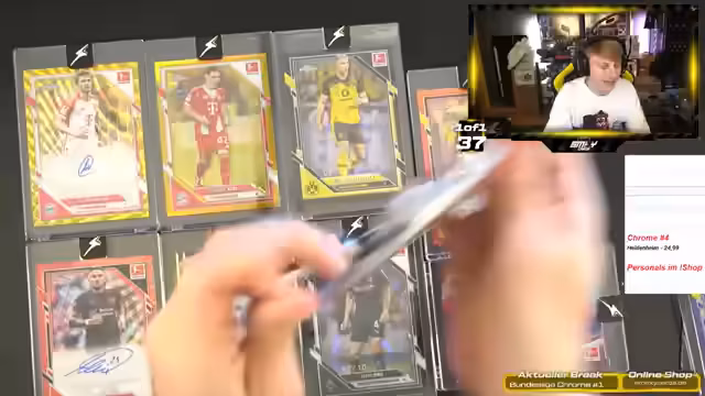 00:30:18Es geht mit dem ersten Case von Bundesligachrome Hashtag 1 in den Break. Die erste Box liefert bereits starke Hits mit einer nummerierten Thomas-Müller-Karte zu 50 und weiteren nummerierten Karten wie Kevin De Bruyne zu 61. Im Verlauf der Box fallen Hits wie ein Triple-Double-Auto von Lennart Kahl und ein nummerierter Königsdörfer zu 99 für HSV. Die Box endet mit einer niedrig nummerierten EA-BVB-Rookie-Karte. Der Streamer entscheidet, nummerierte Karten und Autos in Sleeves zu packen und nicht in Mecks, um die Karten zu schützen.