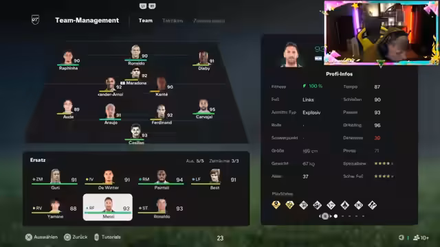 01:25:58In den weiteren FIFA-Spielen testet der Streamer verschiedene Taktiken mit seinem Birthday-Team. Er entscheidet sich, Diaby auf 'Verteidigung' zu positionieren, statt ihn auf Zehner zu spielen, was ihm bessere Ergebnisse bringt. Das Team besteht aus Stars wie Maradona, CR7, Xavi und Trent Alexander-Arnold. Trotz starker individualer Leistungen, wie einem Tor von Diaby, hat er weiterhin Probleme mit der Teambalance und der Verteidigung. Es wird deutlich, dass er noch viele Anpassungen vornehmen muss, um erfolgreich in der Weekend League zu sein.