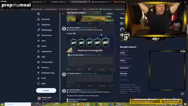 01:50:17Im Stream wird ein Leak über die mögliche Einführung von Pokémon-Karten in EA FC nach 20 Jahren diskutiert. Der Streamer hat im Vorfeld nach dem Leak auf Cardmarket.com günstige Automatikopäck gekauft, da der Wert der Karten möglicherweise steigen wird. Zeitgleich gibt es Spekulationen über ein neues Exchange-System, bei dem man Karten abgeben und neue dafür erhalten könnte. Der genaue Zeitpunkt der Einführung ist unklar, entweder heute oder in zwei Wochen, was die Spannung im Chat erhöht.