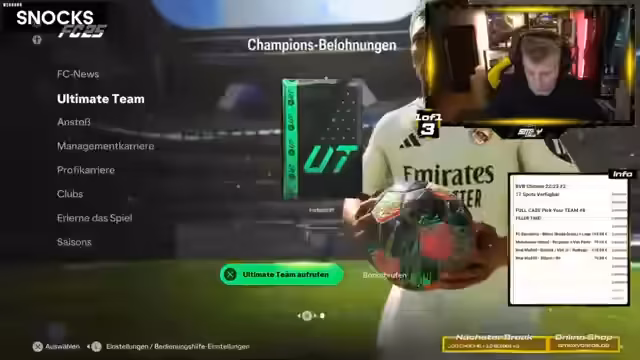 00:42:20Nachdem die Teilnehmer im Chat signalisieren, dass sie keinen Filler wünschen, beschließt der Streamer, mit dem Break-Opening fortfzufahren und stattdessen in den FIFA-Modus zu wechseln. Der Filler, der auf 9,60 Euro pro Los hätte kommen sollen, wird vorerst zurückgestellt. Anstatt dessen bereitet der Streamer den Start vor, um gemeinsam mit den Zuschauern Packs zu ziehen und an aktuellen SBCs (Squad Building Challenges) zu arbeiten. Der Wechsel erfolgt reibungslos und bietet eine neue Aktivität innerhalb des Streams.