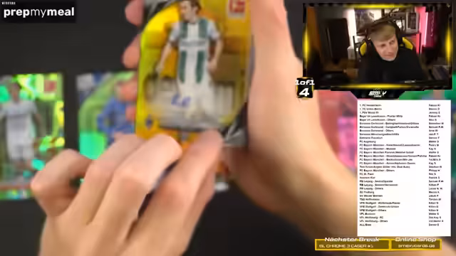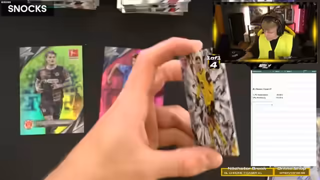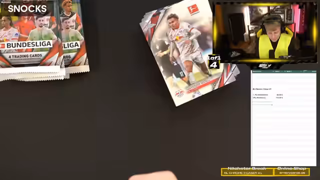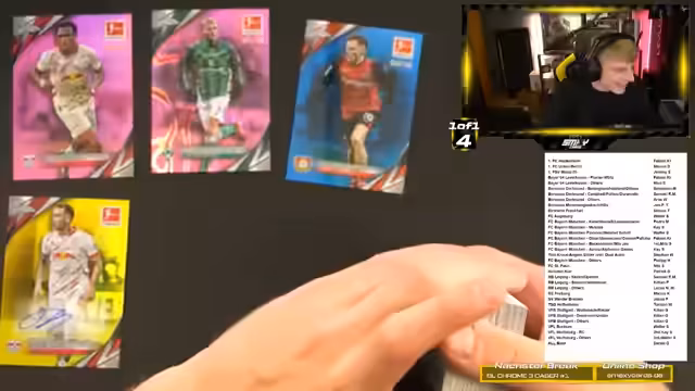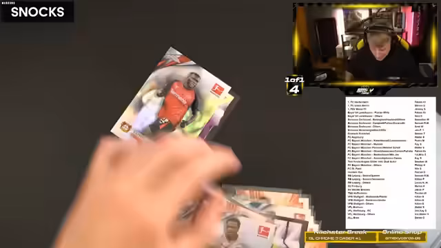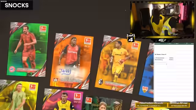03:43:03Die Hauptaktivität des Streams besteht in der Eröffnung von fünf Cases des Produkts Bundesliga Chrome. Insgesamt wurden zwölf Boxen geöffnet, die jeweils eine Unterschrift und mehrere nummerierte Karten enthalten. Der Fokus liegt auf dem Finden von Hitzern (Hits), also besonders raren oder wertvollen Karten. Highlights aus den Cases sind unter anderem eine Kimmich-Auto-Karte, eine Pascal-Groß-Karte, die Zahlungen des Verkaufspreises von fast 250 Euro für eine Kartenauflage und eine besonders seltene True-Gold- oder True-Yellow-Karte.